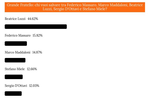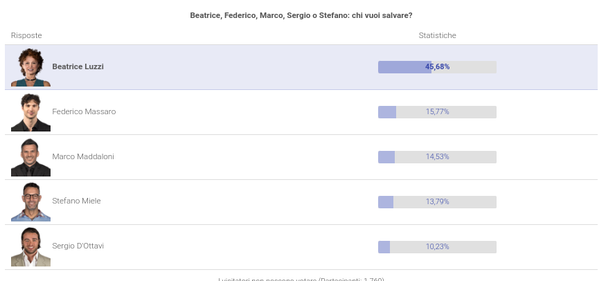 Eliminato Grande Fratello del 21 febbraio: scopriamo cosa dicono i sondaggi online. Stasera assisteremo al nuovo concorrente che dovrà abbandonare la Casa più spiata d’Italia: cosa ci rivelano le preferenze del web? Vediamo a seguire chi rischia di uscire tra Beatrice Luzzi, Sergio D’Ottavi, Marco Maddaloni, Stefano Miele e Federico Massaro.