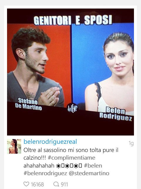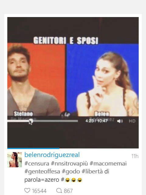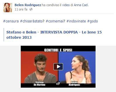 Sul sito di Video Mediaset e sul sito ufficiale de Le Iene, il video di Stefano e Belen è scomparso. La showgirl però, l’ha comunque condiviso su Facebook, accompagnandolo da una serie di hashtag: “#censura #chisaràstato? #comemai? #indovinate #godo” e non solo, ha condiviso un pezzetto del video anche sul suo profilo Instagram, anche lì, seguito da una serie di hashtag, tra cui: “#nonsitrovapiù #genteoffesa #libertà di parola=zero”.