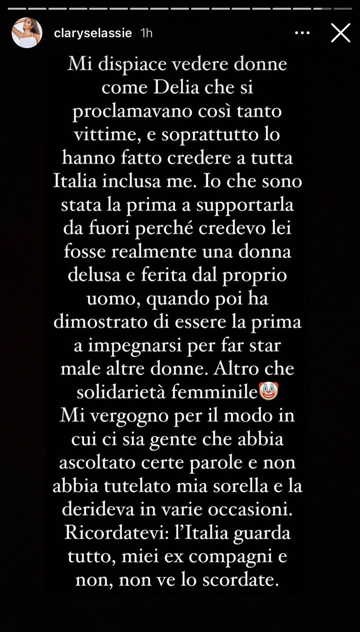 Mi dispiace vedere donne come Delia che si proclamavano così tanto vittime, e soprattutto lo hanno fatto credere a tutta Italia inclusa me. Io che sono stata la prima a supportarla da fuori perchè credevo lei fosse realmente una donna delusa e ferita dal proprio uomo, quando poi ha dimostrato di essere la prima a impegnarsi per far stare male altre donne.