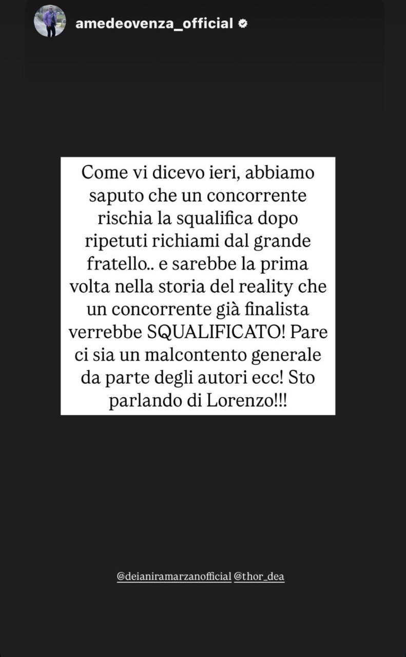 Come vi dicevo ieri, abbiamo saputo che un concorrente rischia la squalifica dopo ripetuti richiami dal Grande Fratello. E sarebbe la prima volta nella storia del reality che un concorrente già finalista verrebbe SQUALIFICATO! Pare ci sia un malcontento generale da parte degli autori ecc. Sto parlando di Lorenzo.