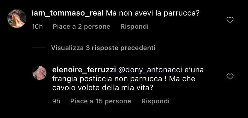 A quanto pare, i capelli di Elenoire sarebbero veri (a sua detta). L’ex concorrente del Grande Fratello Vip, sarebbe entrata nella Casa solamente con la frangia posticcia, come da lei stessa dichiarato tra i commenti Instagram che l’accusavano di avere una parrucca.