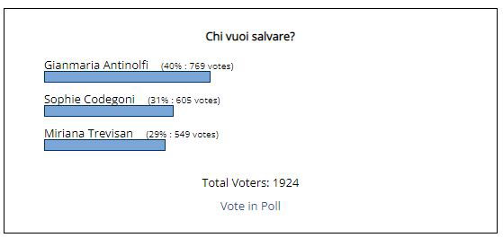 Non ci resta che dare subito uno sguardo ai risultati del sondaggio realizzato da Reality House. Gli utenti hanno votato per salvare Gianmaria Antinolfi con il 40% delle preferenze, seguito da Sophie al 31% che rischia insieme a Miriana, votata dal 29% degli utenti del portale.