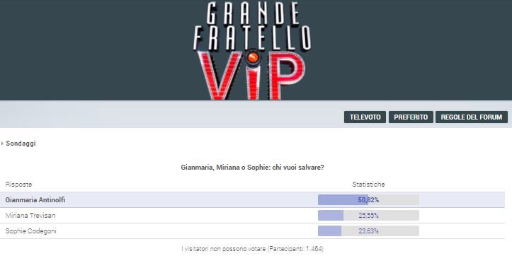 Tra gli altri sondaggi del web, anche quello del portale Grande Fratello Forum che al momento ricalca a grandi linee quanto già trapelato dal precedente sondaggio: anche in questo caso a rischiare maggiormente sono Miriana e Sophie, mentre Gianmaria potrebbe tirare un sospiro di sollievo.