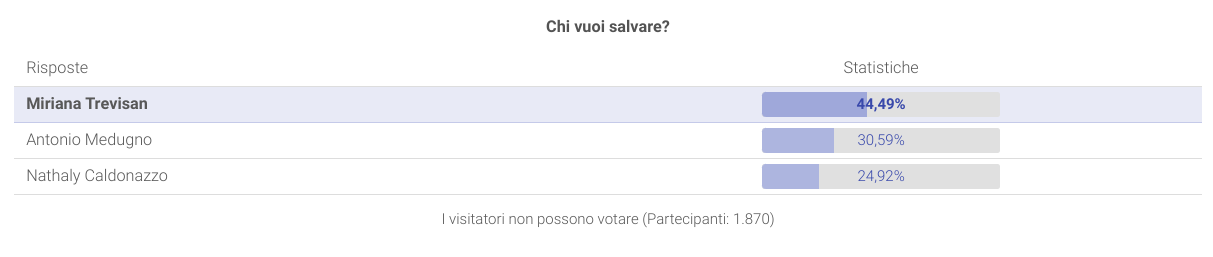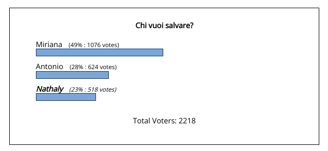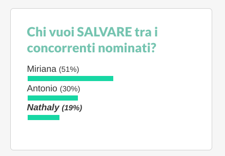 Il televoto anche questa settimana è in positivo (i telespettatori rispondono alla domanda: “Chi vuoi salvare?”). I sondaggi sembrano parlare chiaro: ad avere la peggio potrebbe essere Nathaly Caldonazzo.