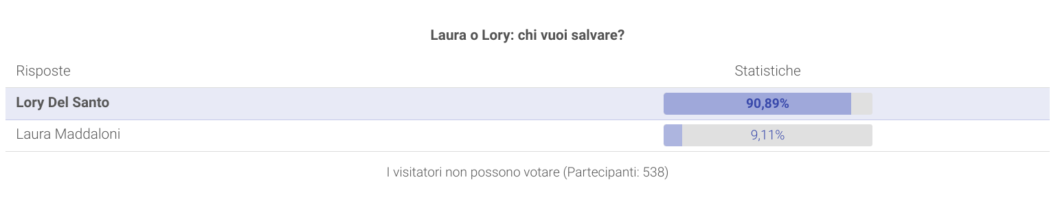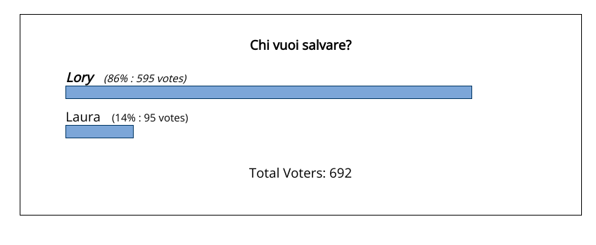 Il televoto questa settimana è in positivo (i telespettatori devono votare rispondendo alla domanda: “Chi vuoi salvare?”) ed i sondaggi parlano decisamente chiaro.