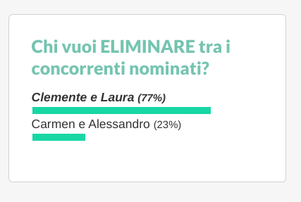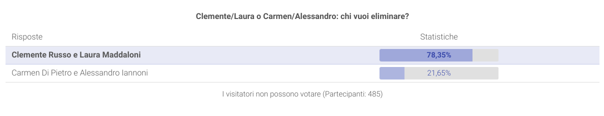 Il televoto questa settimana è in negativo (i telespettatori devono votare rispondendo alla domanda: “Chi vuoi eliminare?”) ed i sondaggi parlano decisamente chiaro.