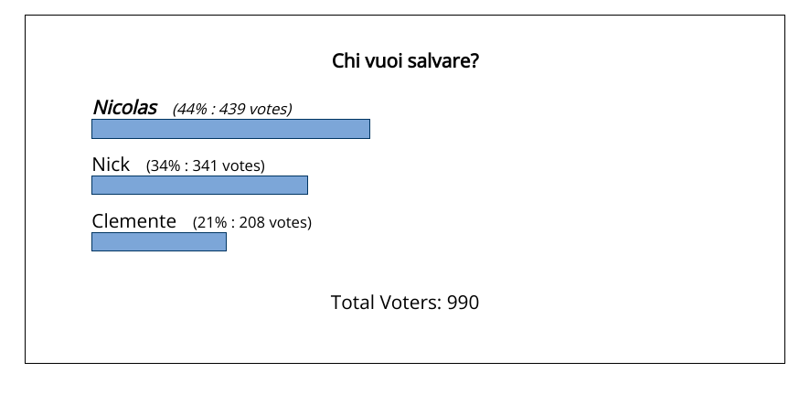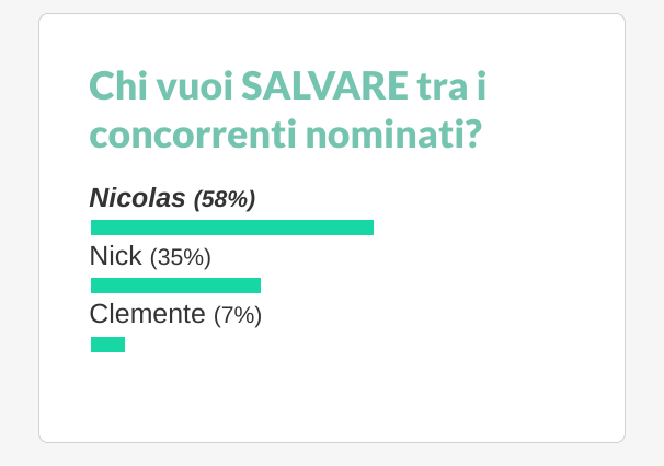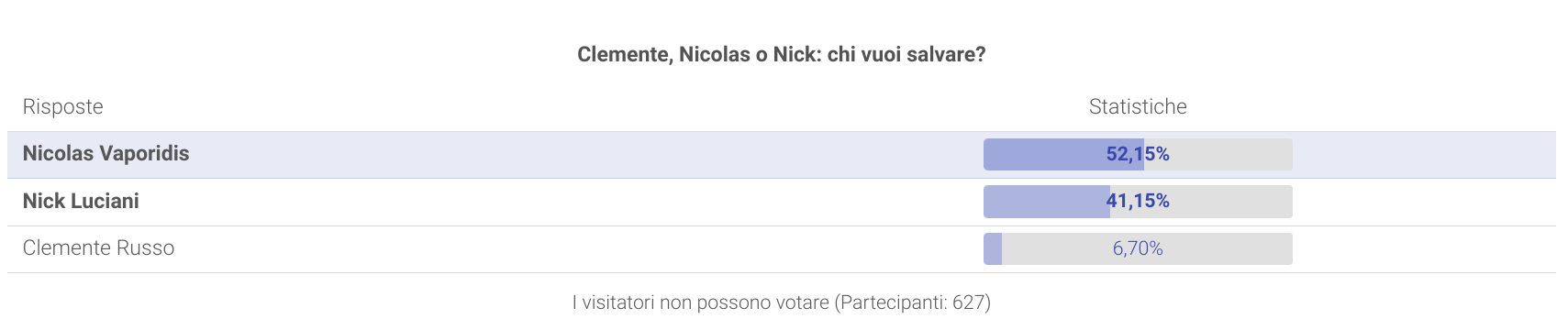 Il televoto questa settimana è in positivo (i telespettatori devono votare rispondendo alla domanda: “Chi vuoi salvare?”) ed i sondaggi parlano decisamente chiaro.