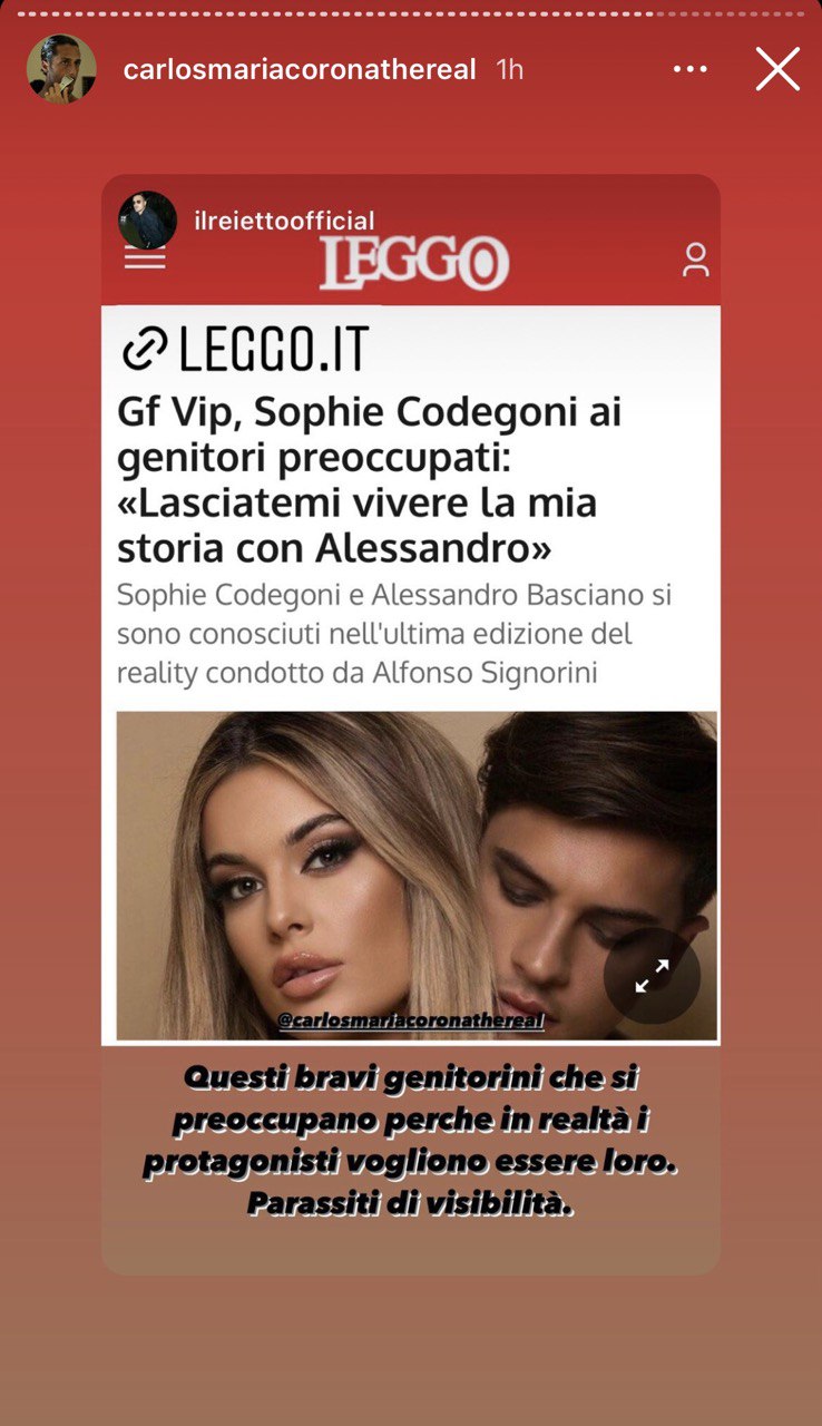 Corona ha condiviso attraverso le Instagram Stories un articolo in cui Sophie Codegoni si rivolgeva ai suoi genitori con una lettera aperta: “Lasciatemi vivere la mia storia con Alessandro”. Proprio i genitori si sarebbero detti preoccupati per la figlia.