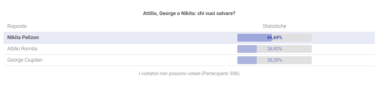 Chiudiamo con il sondaggio del portale Grande Fratello Forum: a primeggiare è Nikita, che si lascia alle spalle Attilio e George.