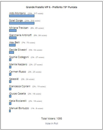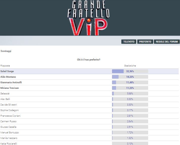 Discorso simile per quanto riguarda il sondaggio ospitata da Grande Fratello Forum, dove Soleil qui gode ancora del primato indiscusso.