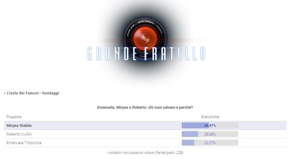 Il secondo sondaggio arriva direttamente dal portale Grande Fratello Forum. In questo caso il nome a rischio eliminazione è quello di Emanuela con il 22,27% ma a breve distanza troviamo Ciufoli con il 29,26%. Dovrebbe salvarsi Miryea, preferita da oltre il 48% dei votanti.