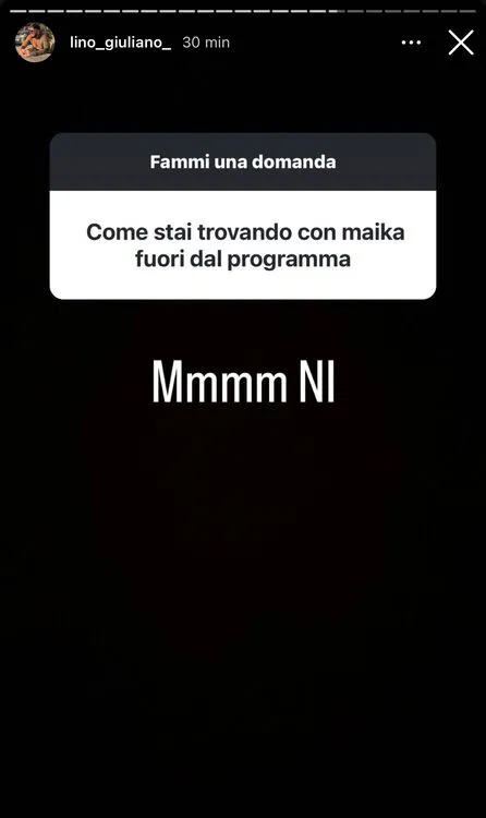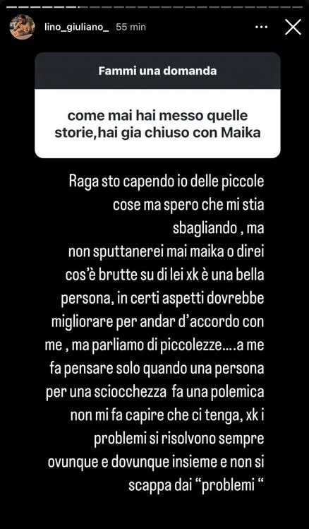 Rispondendo alle curiosità dei suoi follower, infatti, proprio Lino ha evidenziato qualche piccolo problema con Maika. Terminato Temptation Island, il ragazzo ha rivisto la sua tentatrice ma alla domanda su come stia andando tra loro fuori dal programma ha dato una risposta che ha acceso qualche dubbio: “Mmmm… NI”.