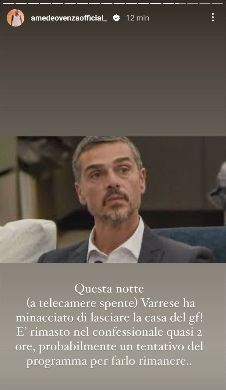 “Questa notte (a telecamere spente) Massimiliano Varrese ha minacciato di lasciare il GF! – scrive Amedeo Venza – E’ rimasto nel confessionale quasi due ore, probabilmente un tentativo del programma di farlo rimanere”.