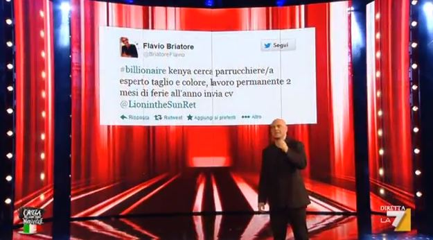 Prima di calarsi totalmente nei panni dell’imprenditore, Crozza ha ricordato l’annuncio di lavoro messo da Briatore su Twitter nel quale cercava un parrucchiere esperto per il suo Billionaire in Kenya. Peccato però che in pochi abbiano risposto; lui, di contro, ha quindi scritto: “Vuol dire che non è vero che non c’è lavoro…”. “Ma ti sembra un lavoro andare in Kenya a pareggiare la frangetta ad Ana Laura Ribas?”, ha ironizzato Crozza, consigliando poi a Briatore di fare The Shampist al posto di The Apprentice. Dopo questa doverosa premessa, il comico ha indossato i panni dell’imprenditore pronto a rispondere alle domande dell’intervistatore.