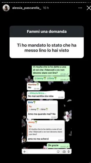 Ma come ha replicato la Pascarella? Alessia ha voluto subito smontare le parole del suo ex mostrando in una Story una chat Whatsapp di gruppo in cui veniva chiesto a Martina De Ioannon, Jenny Guardiano, Siria Pingo e Vittoria Bricarello: “Vi risulta che io ho detto ad una di voi che i fidanzati o ex non devono stare con Lino?”. Ovviamente tutte le amiche hanno negato.