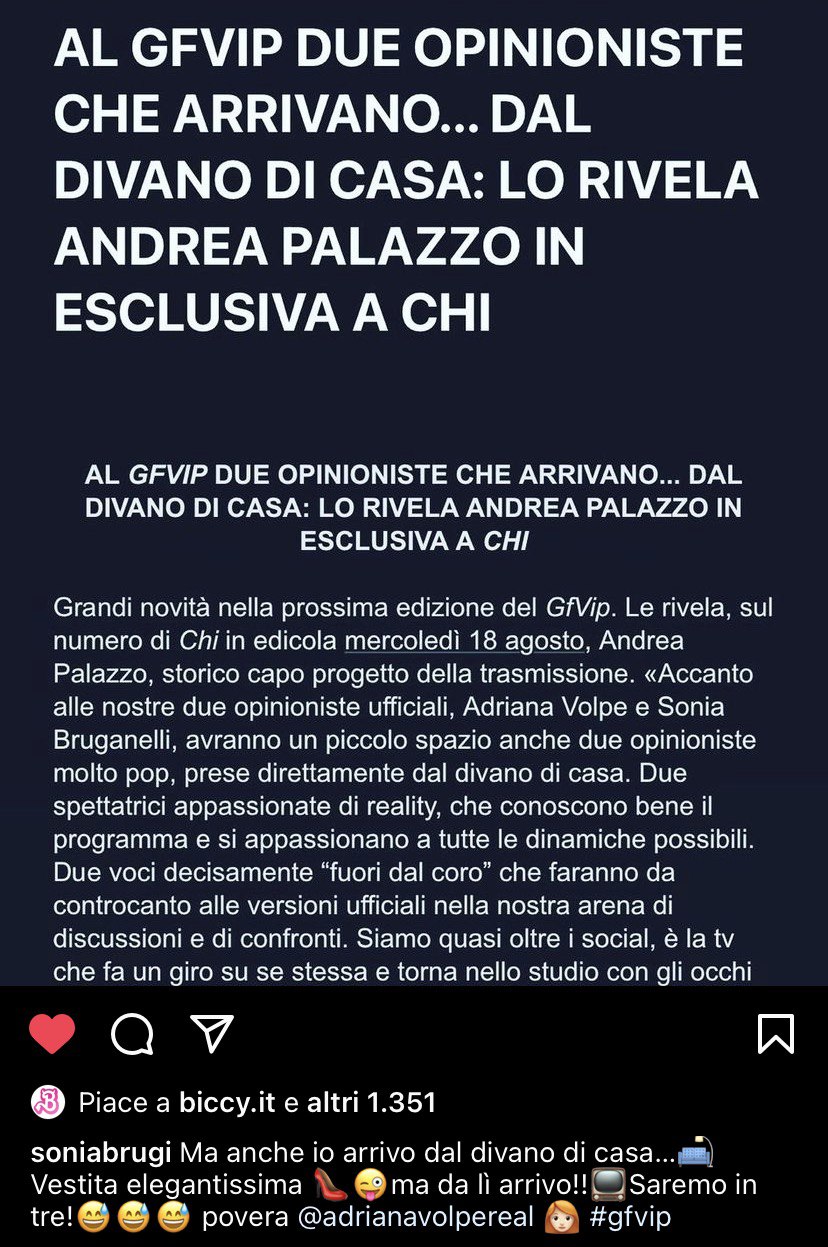 Sonia e Adriana non saranno le sole a commentare le gesta dei nuovi concorrenti protagonisti della spiatissima casa di Cinecittà. E’ quanto rivela il nuovo numero del settimanale Chi, in edicola da mercoledì 18 agosto. A raccontare la rivoluzione in atto è stato Andrea Palazzo, storico capo progetto della trasmissione: