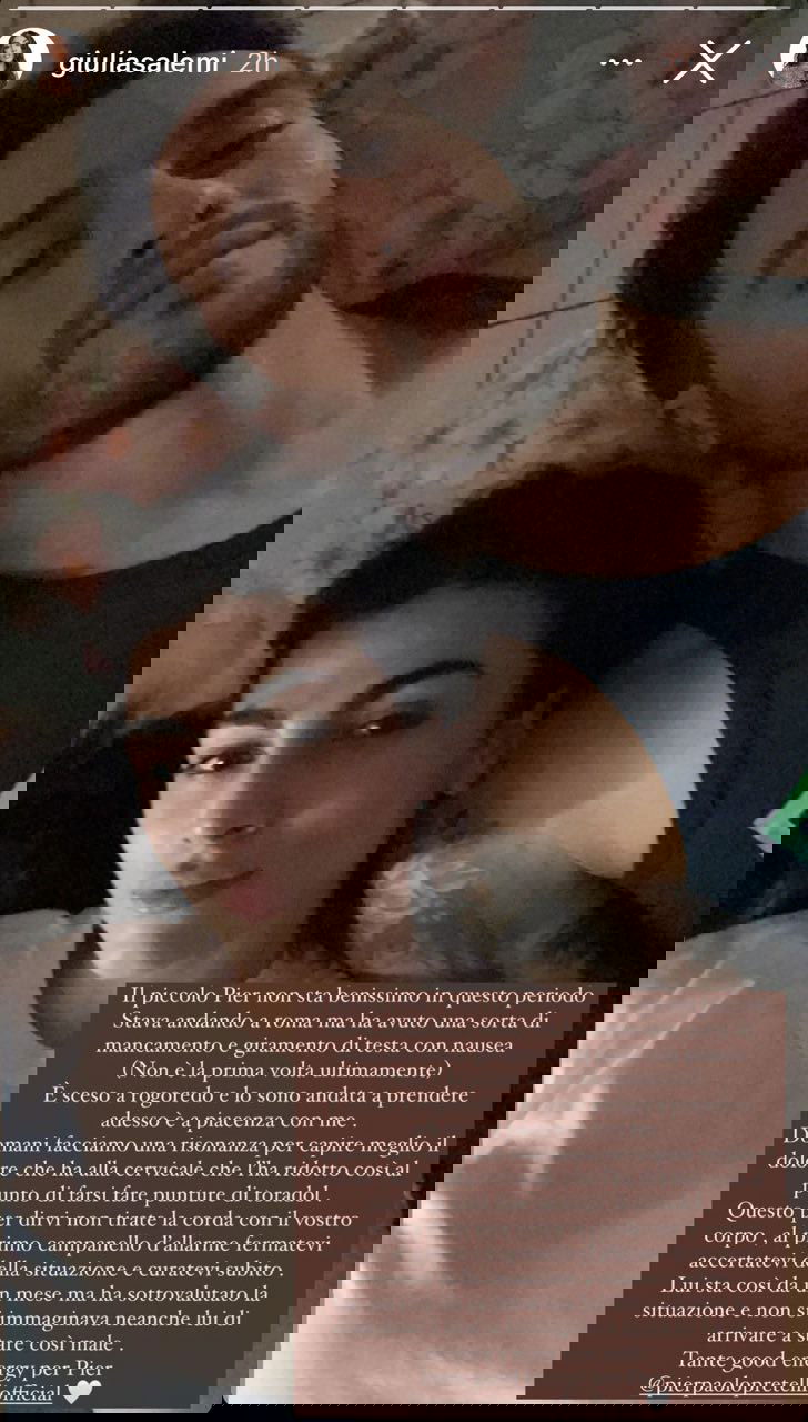 Il piccolo Pier non sta benissimo in questo periodo. Stava andando a Roma ma ha avuto una sorta di mancamento e giramento di testa con nausea (Non è la prima volta ultimamente). – ha scritto Giulia – È sceso a Rogoredo e lo sono andata a prendere… adesso è a Piacenza con me.
