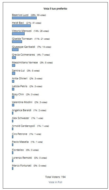 Ecco invece cosa rivela il sondaggio ospitato su Grande Fratello Forum. Se Beatrice resta in modo incontrastato la preferita, alle sue spalle ritroviamo anche in questo caso Vittorio e Heidi che si sfidano per il secondo posto. Seguono Giselda e Grecia.