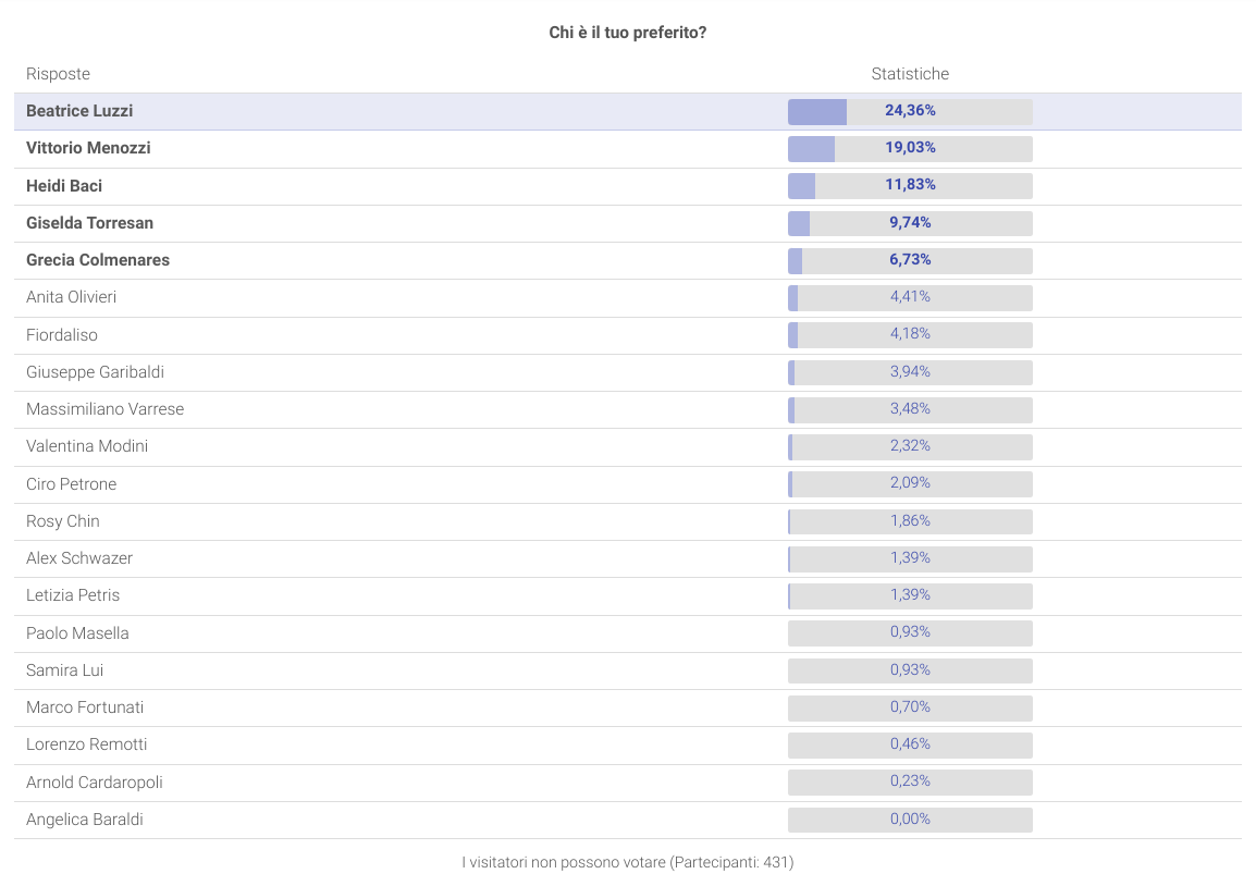 Ma vediamo subito cosa dice il sondaggio ospitato da Reality House. Beatrice resiste con il 28% delle preferenze, seguita da Heidi e da Vittorio. Fuori dal podio Giselda e Giuseppe.