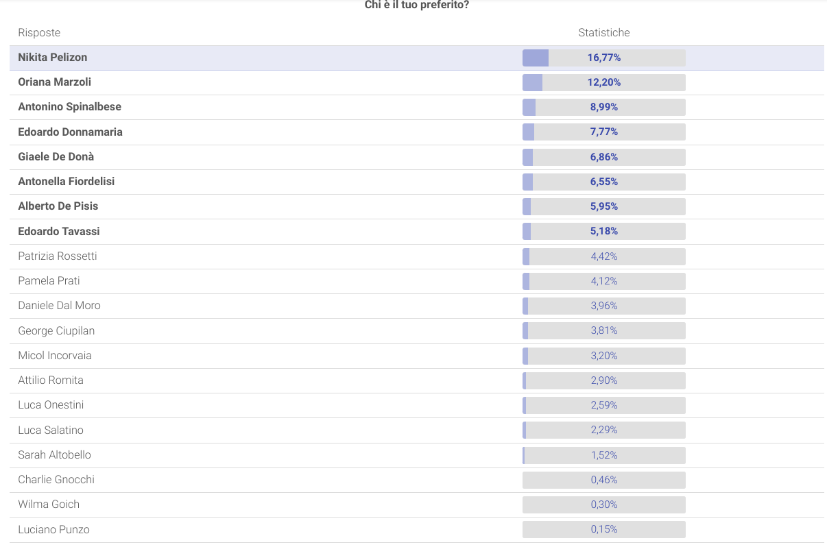 Cosa emerge invece dal sondaggio ospitato dal portale Grande Fratello Forum? In questo caso Nikita resiste al primo posto, ma Oriana si piazza subito alle sue spalle con Antonino Spinalbese.