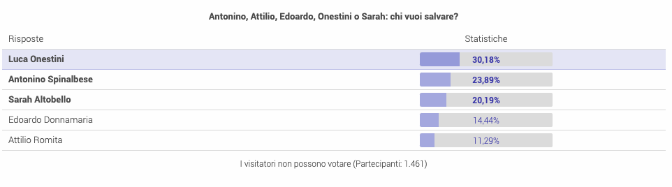 Cinque grandi protagonisti del reality targato Mediaset sono in ballo al televoto: Attilio Romita, Antonino Spinalbese, Edoardo Donnamaria, Luca Onestini e Sarah Altobello.