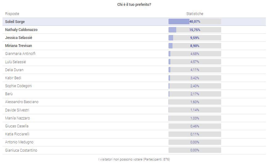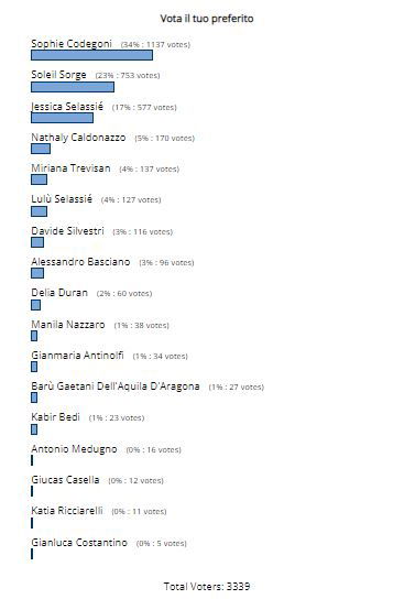 Secondo i risultati del sondaggio ospitato dal portale Reality House, ad avere la meglio è stata ancora una volta Sophie Codegoni, seguita da Soleil e subito dopo dalla maggiore delle sorelle Selassié, alle spalle della quale si è piazzata Nathaly Caldonazzo.