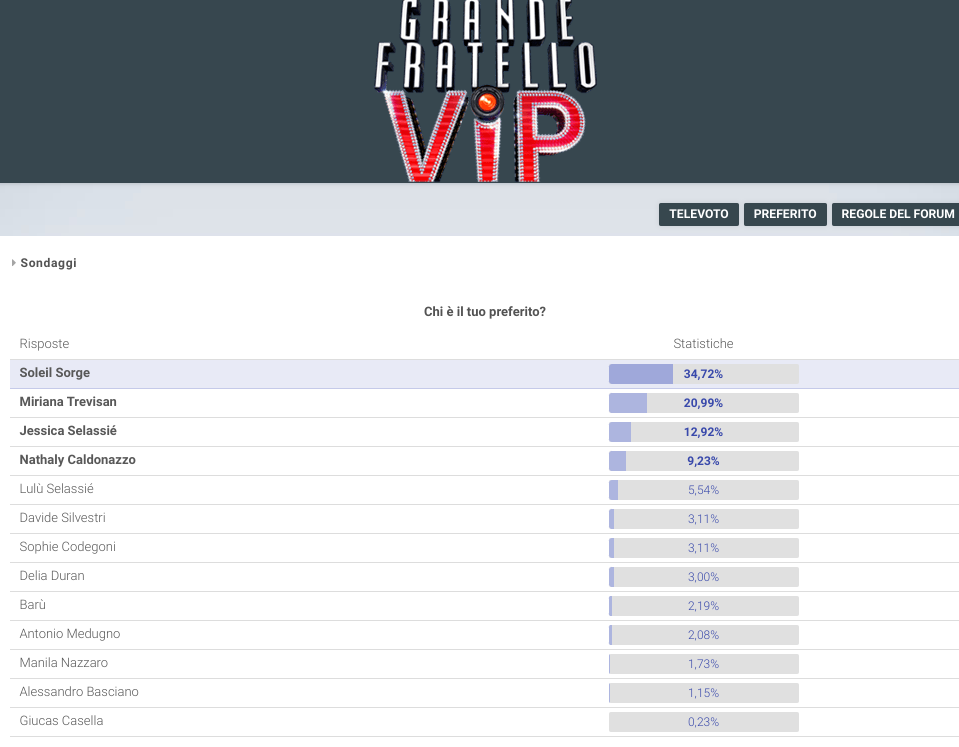 Differenti, come da tradizione, i risultati del sondaggio presente sul portale Grande Fratello Forum, dove Soleil è prima, seguita da Miriana Trevisan e poi ancora da Jessica Selassié.