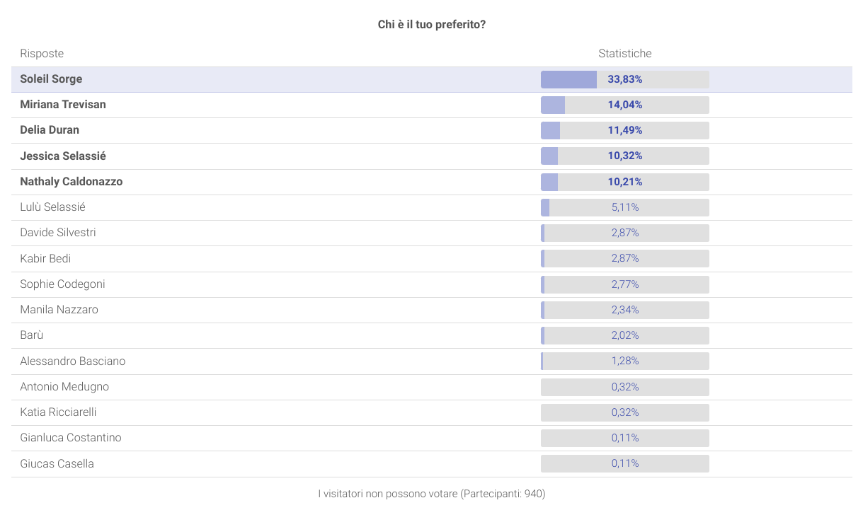 Secondo i risultati del sondaggio ospitato dal portale Reality House, ad avere la meglio è stata ancora una volta Sophie Codegoni, seguita da Jessica Selassié e solo al terzo posto dalla Sorge.