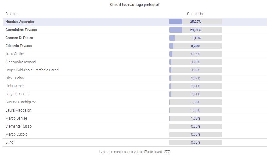 Un altro sondaggio è ospitato sul portale Grande Fratello Forum e vede in cima alle preferenze Nicolas Vaporidis, seguito da Guendalina Tavassi e poi da Carmen Di Pietro, mentre quarto Edoardo Tavassi.