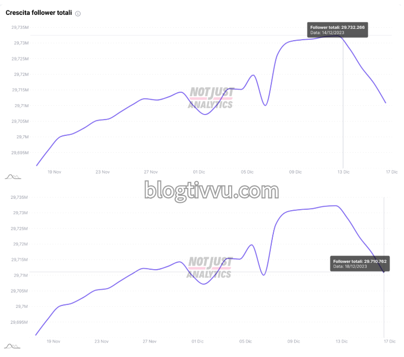 Briciole, rispetto ai quasi 30 milioni di follower di Chiara. In realtà dando uno sguardo ai dati di Not Just Analytics il calo sarebbe ben superiore (oltre 20mila follower, ma un numero comunque non preoccupante rispetto agli attuali utenti).
