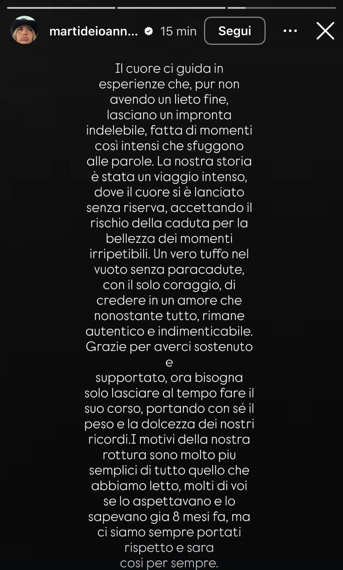 “Il cuore ci guida in esperienze che, pur non avendo un lieto fine, lasciano un’impronta indelebile, fatta di momenti così intensi che sfuggono alle parole. La nostra storia è stata un viaggio intenso, dove il cuore si è lanciato senza riserva, accettando il rischio della caduta per la bellezza dei momenti irripetibili. Un vero tuffo nel vuoto senza paracadute, con il solo coraggio, di credere in un amore che nonostante tutto, rimane autentico e indimenticabile. Grazie per averci sostenuto e supportato, ora bisogna solo lasciare al tempo fare il suo corso, portando con sé il peso e la dolcezza dei nostri ricordi. I motivi della nostra rottura sono molto più semplici di tutto quello che abbiamo letto, molti di voi se lo aspettavano e lo sapevano già 8 mesi fa, ma ci siamo sempre portati rispetto e sarà così per sempre.”