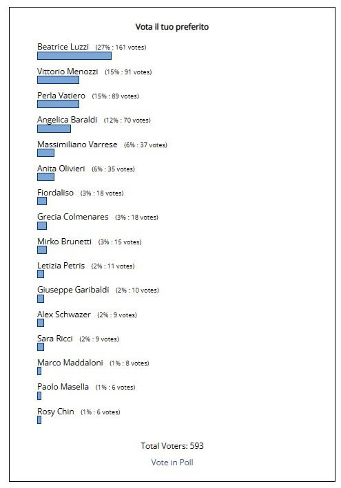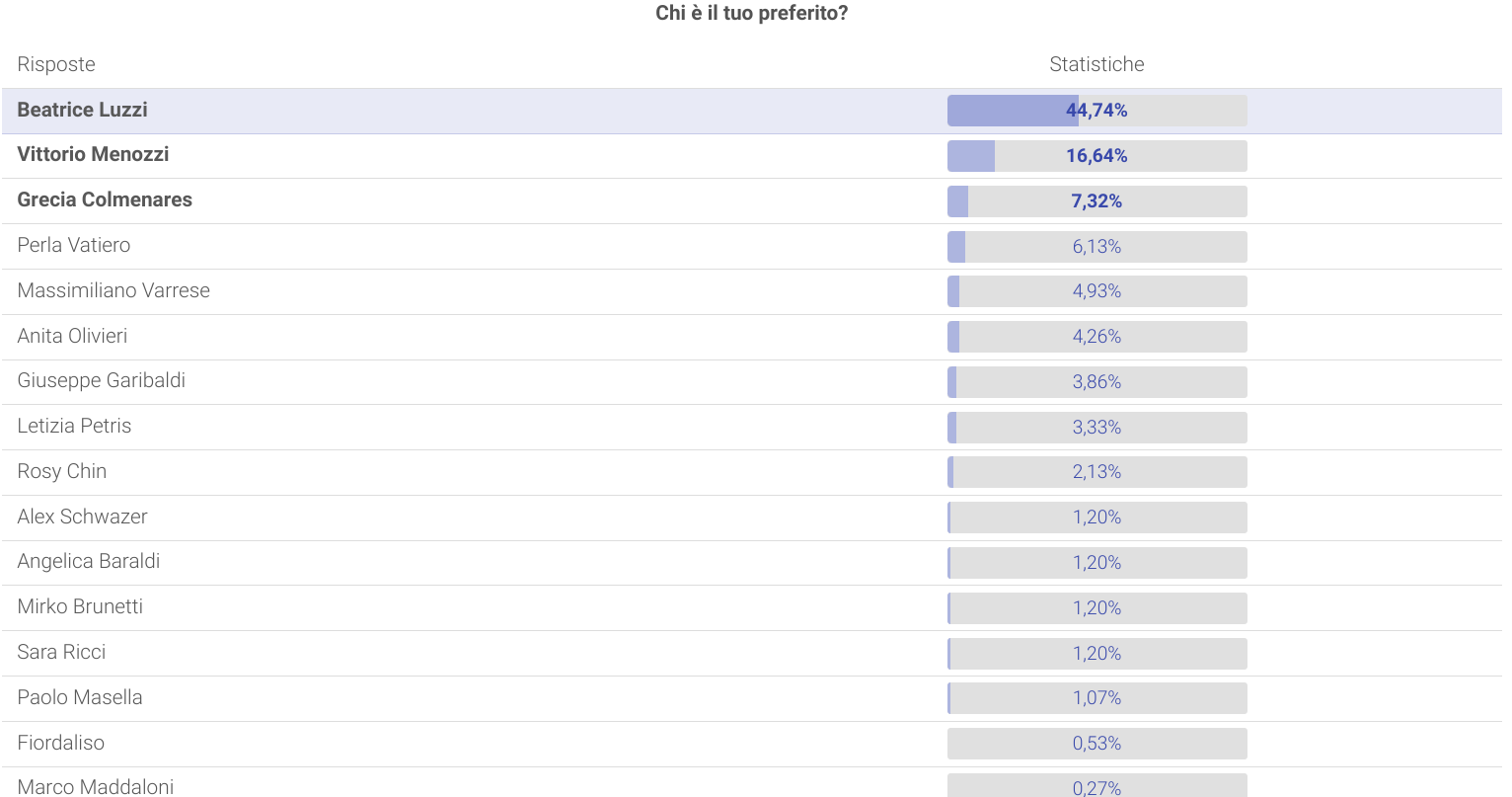 Tra i sondaggi del Grande Fratello, quello ospitato da Reality House e dedicato al preferito vede in cima al podio Beatrice con il 27% dei voti, seguita da Vittorio Menozzi (15%) e da Perla Vatiero (15%).