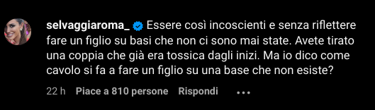 Essere così incoscienti e senza riflettere fare un figlio su basi che non ci sono mai state. Avete tirato una coppia che già era tossica dagli inizi. Ma io dico come cavolo si fa a fare un figlio su una base che non esiste?