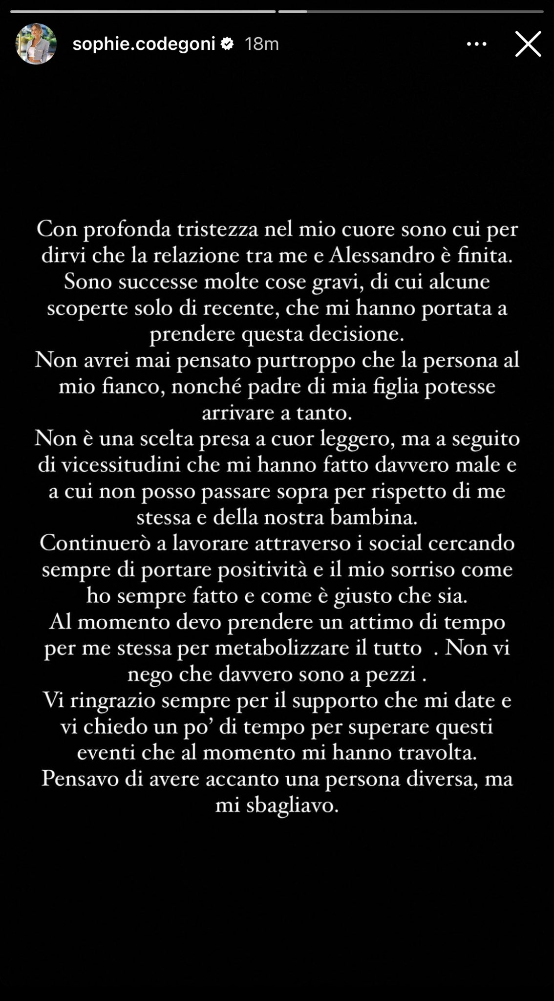 Con profonda tristezza nel mio cuore sono qui per dirvi che la relazione tra me e Alessandro è finita. Sono successe molte cose gravi, di cui alcune scoperte solo di recente, che mi hanno portata a prendere questa decisione.