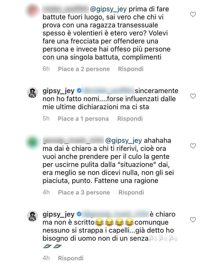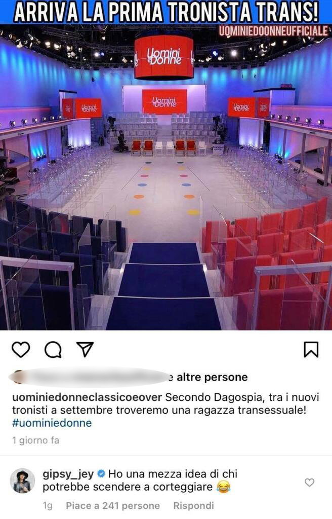 “Ho una mezza idea di chi potrebbe scendere a corteggiare”, ha commentato l’ex tronista, aggiungendo una emoji che ride a crepapelle. Le sue parole però non sono piaciute ad alcuni utenti che le hanno prontamente fatto notare la battuta fuori luogo. “Sinceramente non ho fatto nomi”, si è difesa lei. E quando le è stato fatto notare che era chiaro il riferimento ha replicato divertita: “E’ chiaro ma non è scritto. Comunque nessuno si strappa i capelli… già detto che ho bisogno di un uomo non di un senza…”.